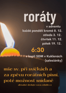 Zveme vás na adventní roráty k nám do SDM při svíčkách tradičním zpěvu.